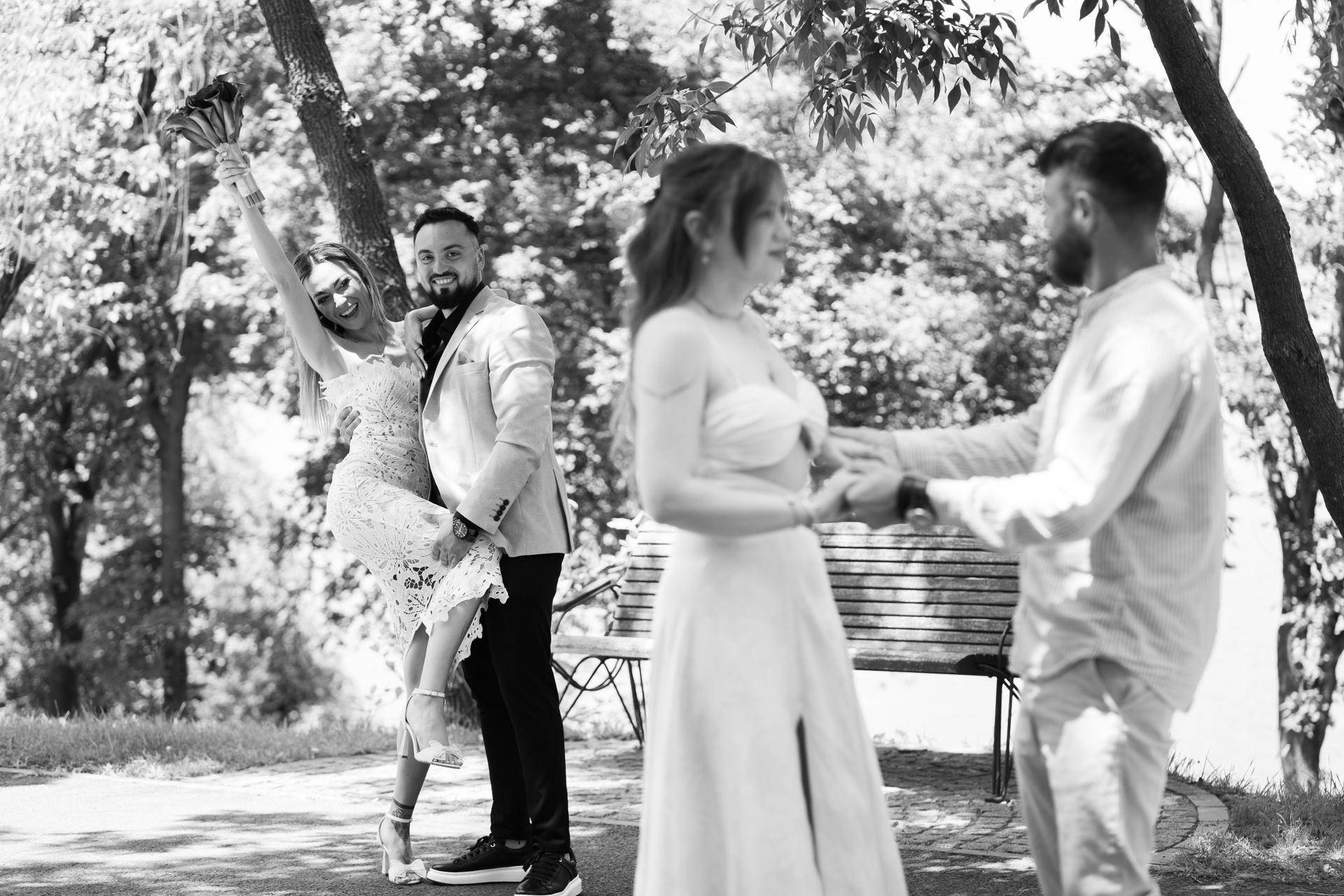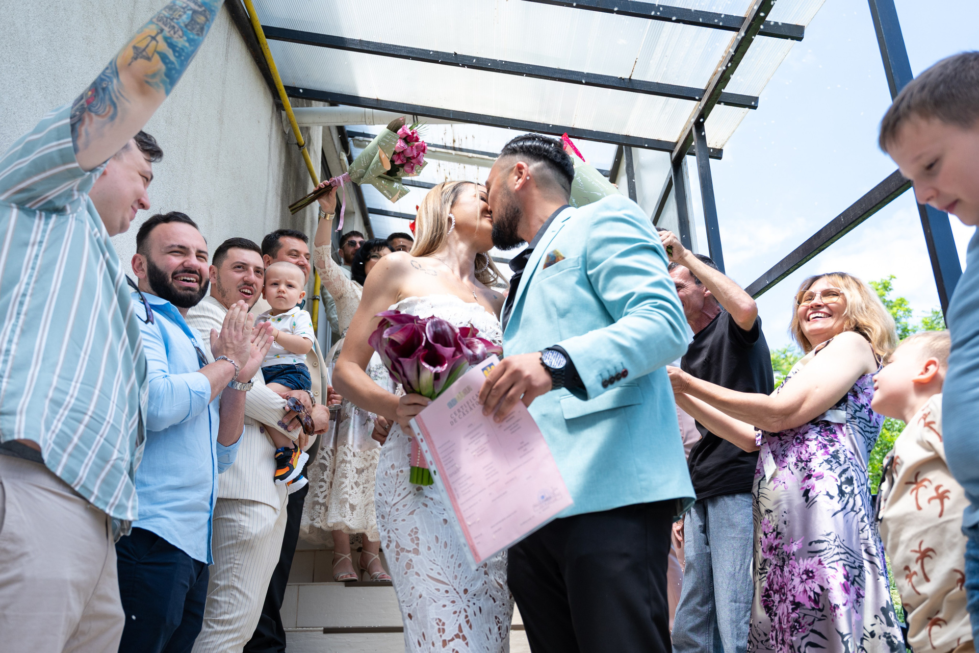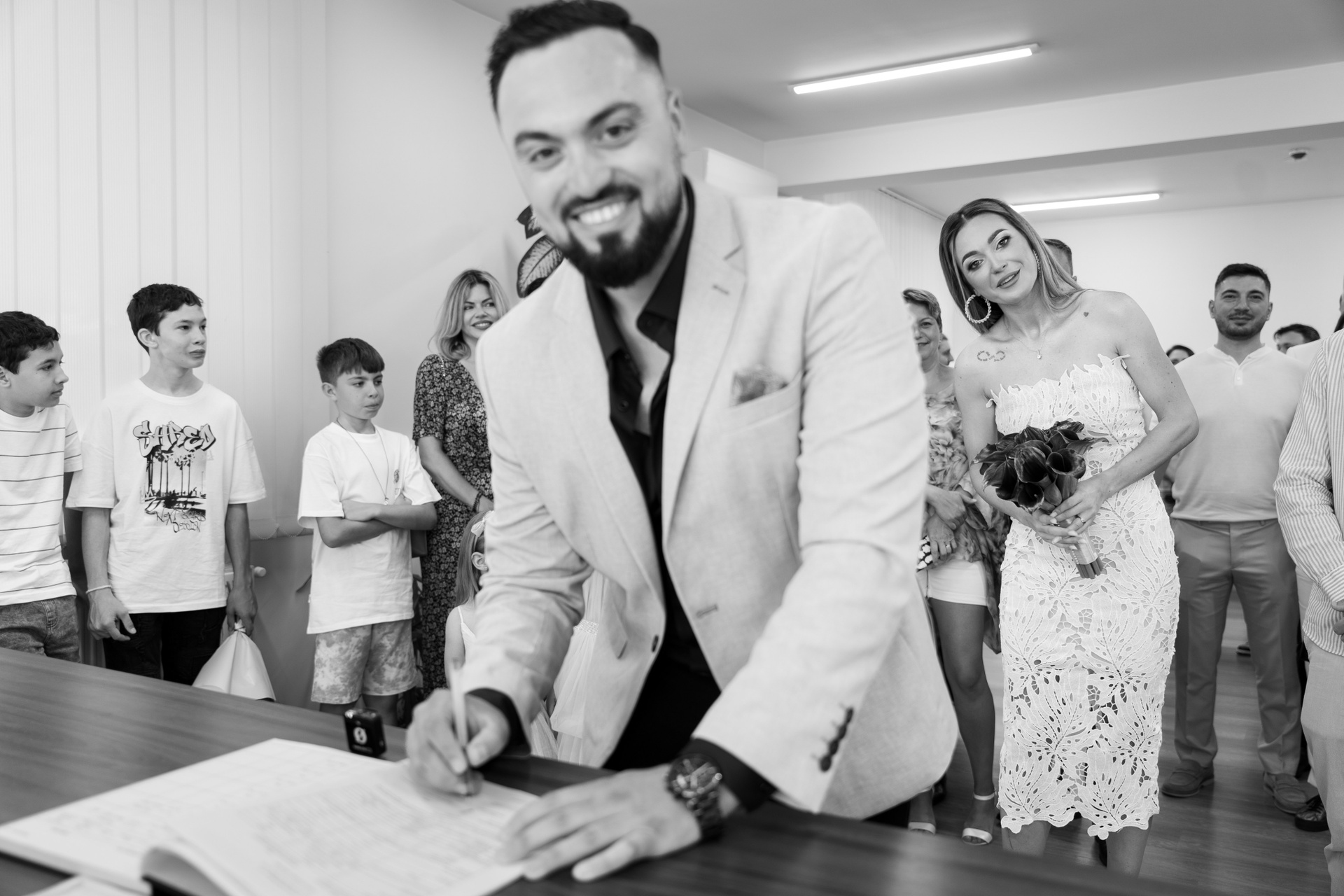 Pe parcursul ceremoniei și al momentelor petrecute împreună, scenele redau o varietate de stări și sentimente: de la emoția discretă a unui zâmbet schimbat între cei doi, la momentele luminoase și pline de viață în care prietenii și familia îi înconjoară cu aplauze și priviri calde. Fiecare fotografie este compusă cu atenție, surprinzând nu doar ceea ce se vede, ci și ceea ce se simte — acele clipe de sinceritate pură, priviri intense și zâmbete care rămân vii în amintire.